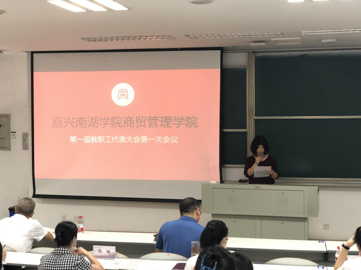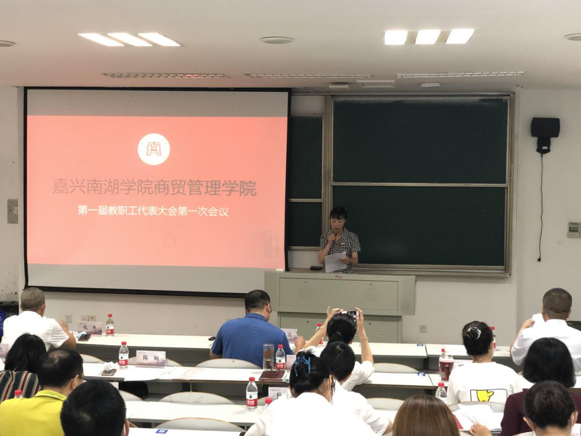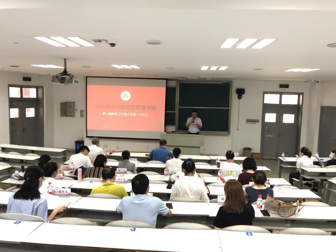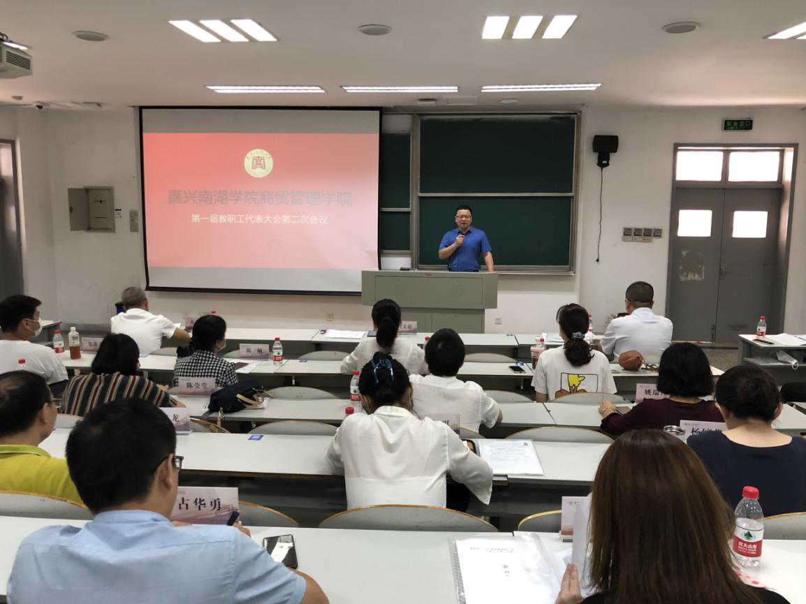 2021年9月11日下午嘉兴南湖学院商贸管理学院第一届教职工代表大会第一次会议在教一519教室召开。学校党委副书记胡文蔚莅临指导本次会议,学院党政领导班子成员孔冬、刘勇及学院17名教职工代表出席大会。