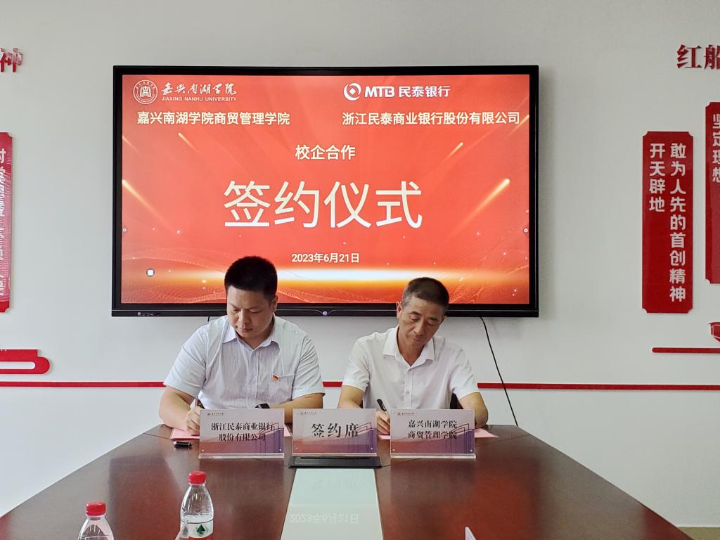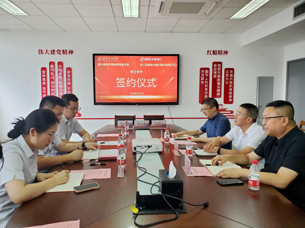 6月21日下午,嘉兴南湖学院商贸管理学院与浙江民泰商业银行合作签约仪式在嘉兴南湖学院商贸管理学院举行。嘉兴南湖学院商贸管理学院院长孔冬、副书记刘勇、副院长夏江华、浙江民泰商业银行嘉兴分行副行长刘柏廷、浙江民泰商业银行人力资源部等人员出席签约仪式。