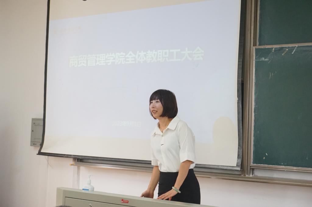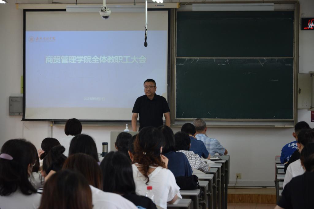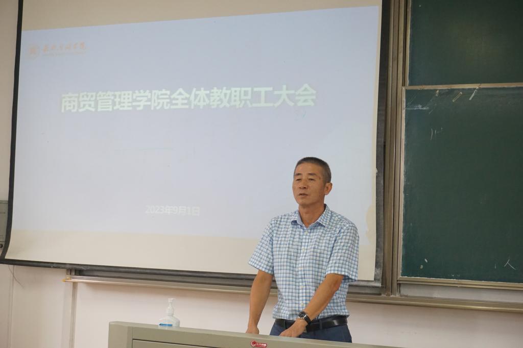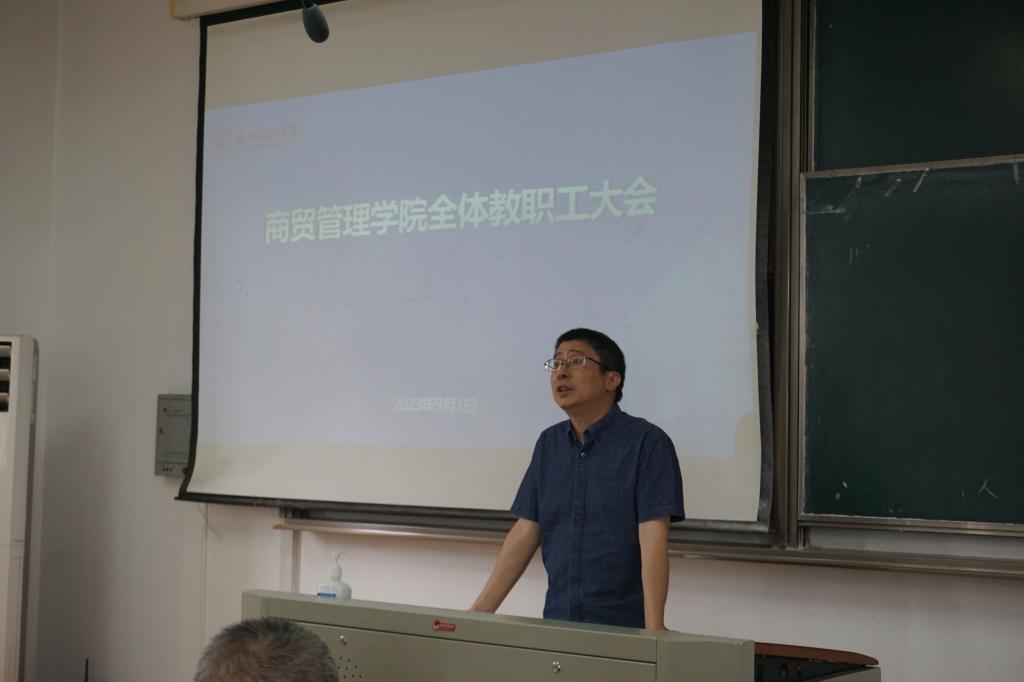 2023年9月1日上午,商贸管理学院在教一403召开2023-2024学年第一学期全体教职工大会。学院院长孔冬,副院长刘勇、夏江华,党委副书记魏巍出席会议,学院全体教职工参会,会议由学院副院长刘勇主持。