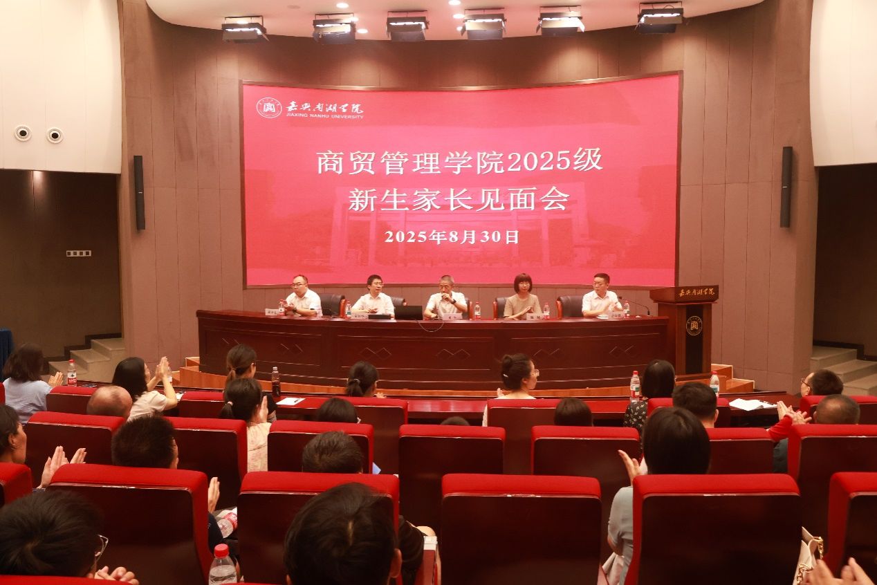 8月30日下午,商贸管理学院在第一报告厅举行了2025级新生家长见面会。学院院长孔冬、副院长魏巍、夏江华、党委副书记占华勇、学术副院长潘嘉亮,各专业负责人及2025级新生辅导员、班主任、家长代表共同参会,会议由占华勇副书记主持。会议伊始,占华勇副书记代表学院对各位家长的到来表示热烈欢迎,对家长们信任并选择商贸管理学院表示衷心感谢。