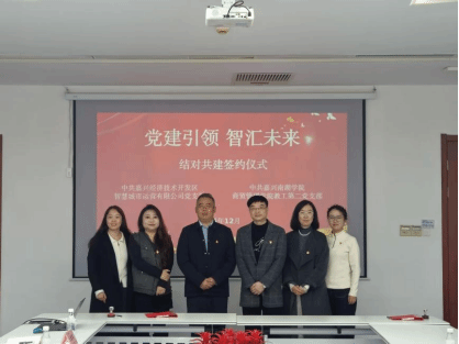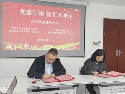 2025年12月11日下午,嘉兴南湖学院商贸管理学院教工第二党支部与嘉兴经济技术开发区智慧城市运营有限公司党支部共建签约仪式在嘉兴经济技术开发区智慧城市运营有限公司举行。双方围绕“智慧党建”“校企合作”“产学驱动”等重点方向达成共建协议。