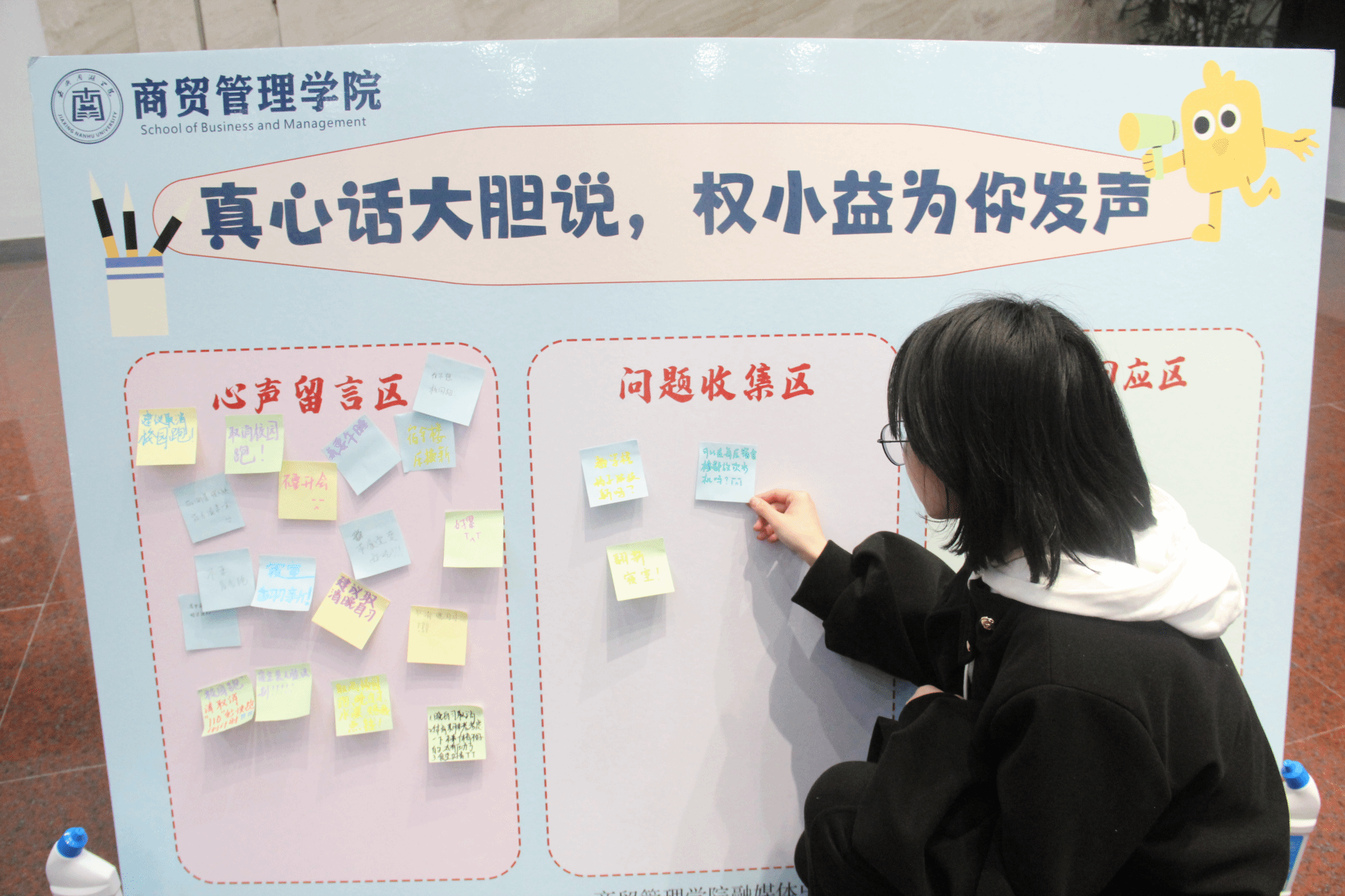 据悉,商贸管理学院自去年下半年起,启动“商院权小益”IP建设工作,以“全心全意为学子服务”为核心宗旨,搭建起全方位、常态化的权益服务平台。期间,学院通过定期收集学生权益诉求,精准对接学校各职能部门,畅通学子诉求表达与问题解决渠道,切实解决学生在学习生活中遇到的急难愁盼问题;同时,每周持续发布“权益小贴士”,普及维权知识、诚信理念及校园服务相关资讯,让权益保护深入人心,逐步形成“有诉求、有回应、有解决、有反馈”的良好工作闭环。